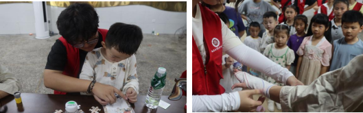 医路童行,急救科普护成长。针对儿童对于安全与健康知识需求,精心策划“医路童行·趣玩急救薪火传红行动”。通过生动的情景模拟和互动教学,向孩子们系统传授了“海姆立克急救法”和“八字包扎法”等关键急救技能,确保每位参与者掌握动作要领。活动巧妙融入红色文化与趣味游戏,设置了“漆扇绘初心”、“红色拼图大挑战”、“障碍物套圈”、“记忆力大比拼”、“动物园里有什么”、“手工制作旋转扭扭乐”等集章环节。孩子们在动手创作漆扇、拼装历史图景、参与体能思维游戏中,不仅收获了快乐与奖品,更潜移默化地接受了红色文化熏陶,提升了安全意识和动手能力。活动覆盖儿童70余名,急救知识普及率达100%。