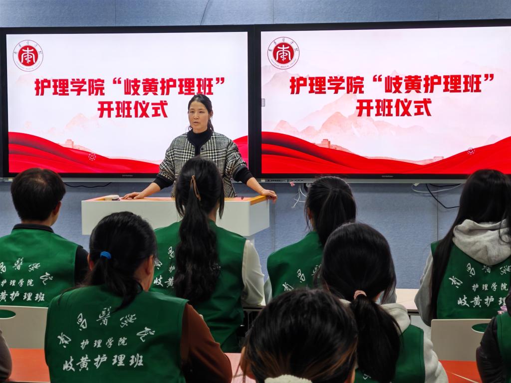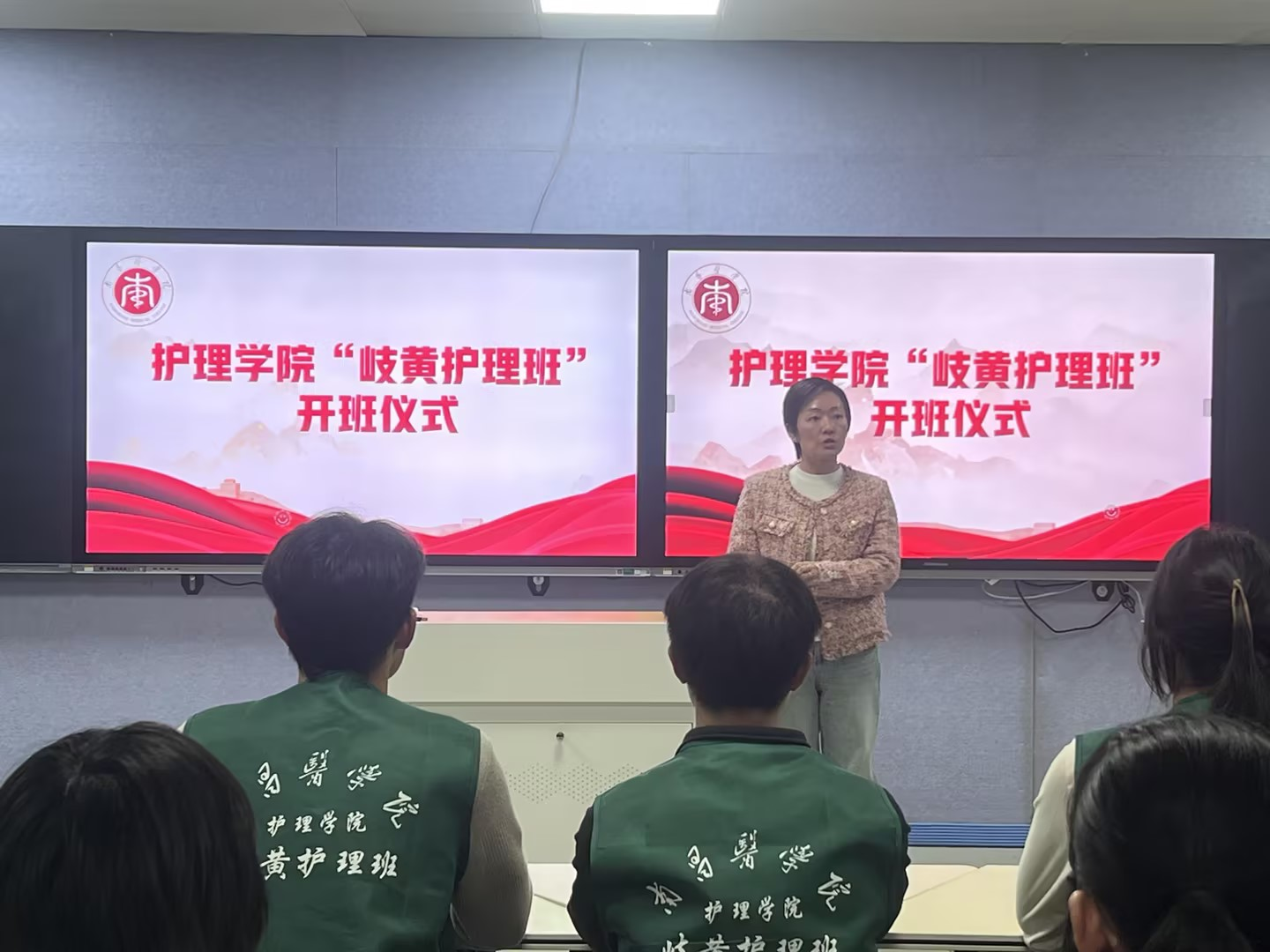 仪式由护理学院副书记吴荣叶主持,学院副书记陈敏致开幕词,她指出,“岐黄护理班”是学院推动“课程思政”与专业教育相结合的重要载体,也是响应“健康中国”战略、传承中医药文化的积极实践,希望同学们珍惜学习机会,在实践中感悟中医智慧,在服务中践行护理使命。