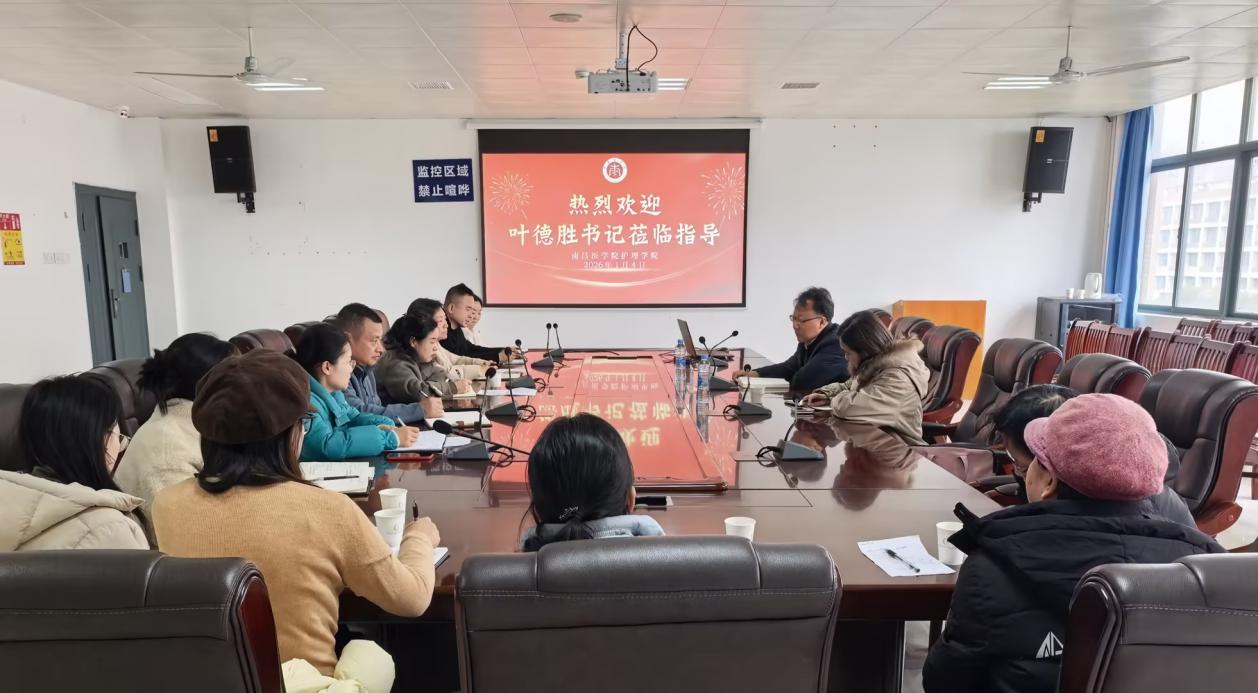 2026年1月4日,学校党委委员、纪委书记叶德胜一行莅临护理学院开展走访调研,深入了解学院党建、党风廉政建设、教育教学及学生管理等工作开展情况,并就推进学院高质量发展提出指导性意见。护理学院领导班子成员、各教研室负责人及教师代表参加调研座谈。