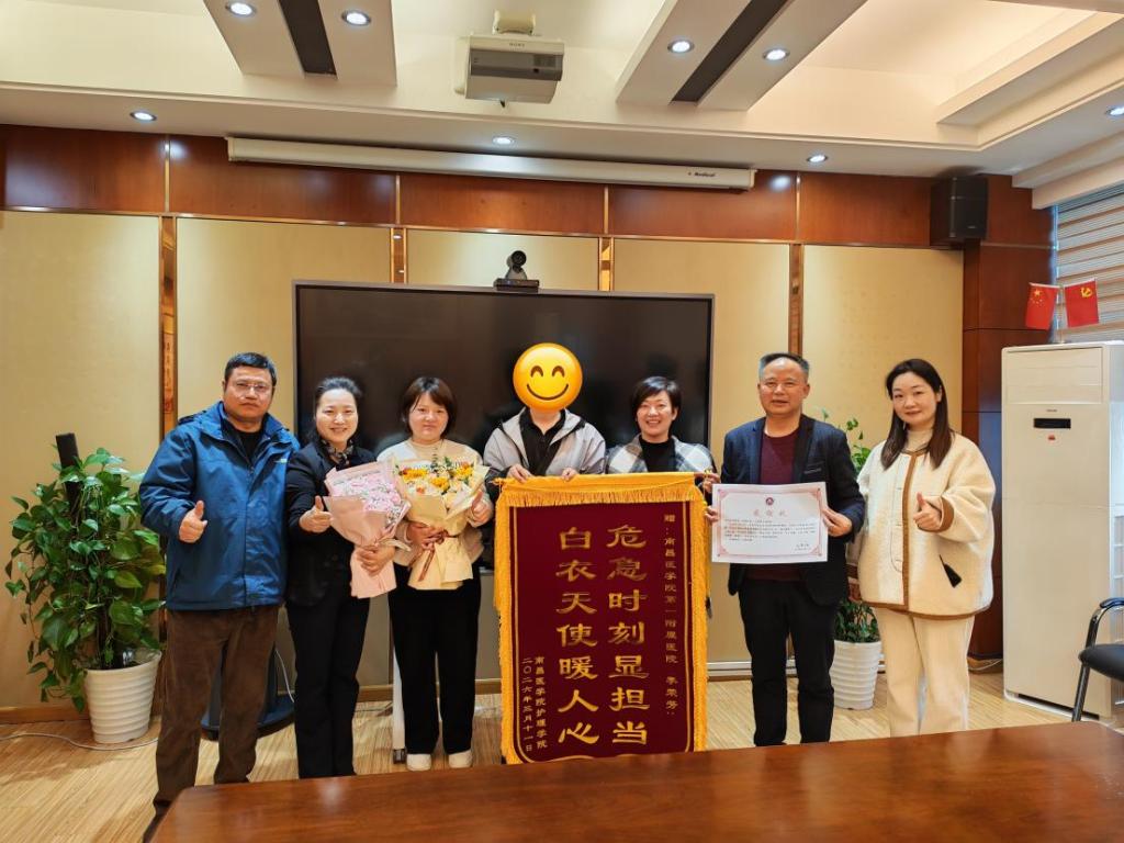 当天,受学校领导委托,临床医学院副院长朱鹏云、护理学院党委副书记陈敏、专职辅导员黄兰带领罗同学,专程前往第一附属医院护理部,向危急时刻挺身而出、成功施救学生生命的护士李荣芳同志当面致谢。朱鹏云代表学校送上感谢信,陈敏代表护理学院赠送了写有“危急时刻显担当 白衣天使暖人心”的锦旗和鲜花。